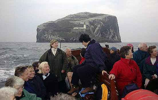 Fred Marr giving the visitors a commentary on the spectacular bird life and fascinating history of the Bass Rock. Fred has been ferrying visitors around the islands in his boat Sula I since 1972, this was replaced by the 41 feet launch Sula II which is still in use today.