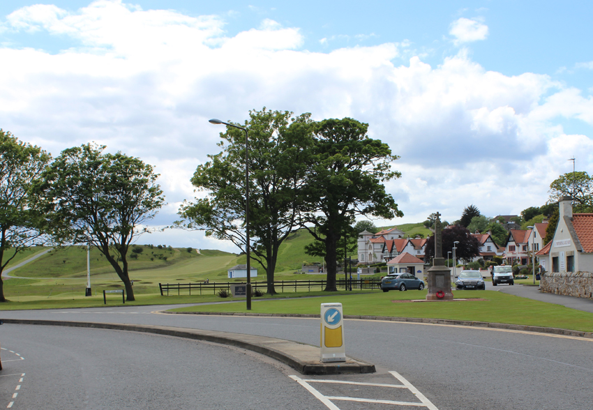 Gullane No.1 first tee under the trees, Starters Box (centre) and Professional's Shop on the right. © Digitalsport UK